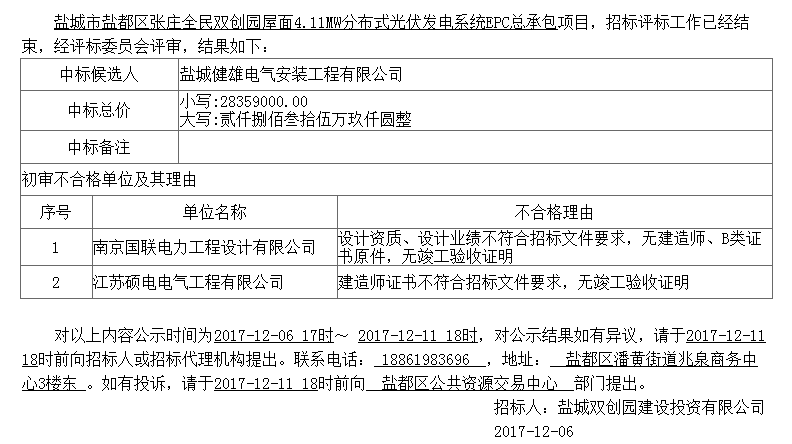 鹽城市鹽都區(qū)張莊全民雙創(chuàng)園屋面4.11MW分布式光伏發(fā)電系統(tǒng)EPC總承包結果公示