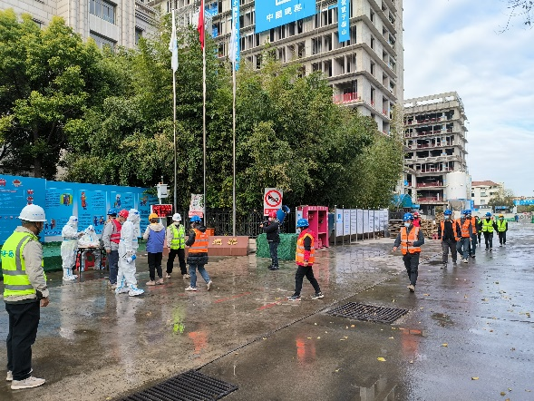 上午9點,演練開始,南三院二期項目部接到市疾控中心電話通知,發(fā)現(xiàn)某建筑工人為陽性患者。項目部第一時間啟動應(yīng)急預(yù)案,各工作組迅速進入應(yīng)急狀態(tài)。防疫小組引導(dǎo)現(xiàn)場隔離,針對陽性患者建立一人一檔,并立即向120求助,上報區(qū)應(yīng)急管理局、衛(wèi)生防疫部門、住建局、屬地街道、業(yè)主、公司防疫辦;救護車到達后迅速轉(zhuǎn)運“確診患者”及3名“密接者”,同時防疫小組協(xié)助流調(diào)人員進行摸排、提供相關(guān)信息;最后醫(yī)護人員對現(xiàn)場所有人員進行核酸檢,并采取相應(yīng)措施。此次演練活動組織有序、節(jié)點緊湊、有條不紊,達到了檢驗預(yù)案、磨合機制、鍛煉隊伍的目的。