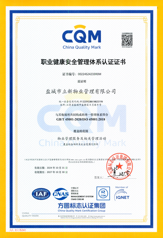 近日,鹽城市立新物業(yè)管理有限公司傳來喜訊,經(jīng)過三個(gè)月的精心籌備與不懈努力,立新物業(yè)公司順利通過了質(zhì)量管理體系ISO9001、環(huán)境管理體系ISO14001、職業(yè)健康安全管理體系ISO45001資質(zhì)認(rèn)證。